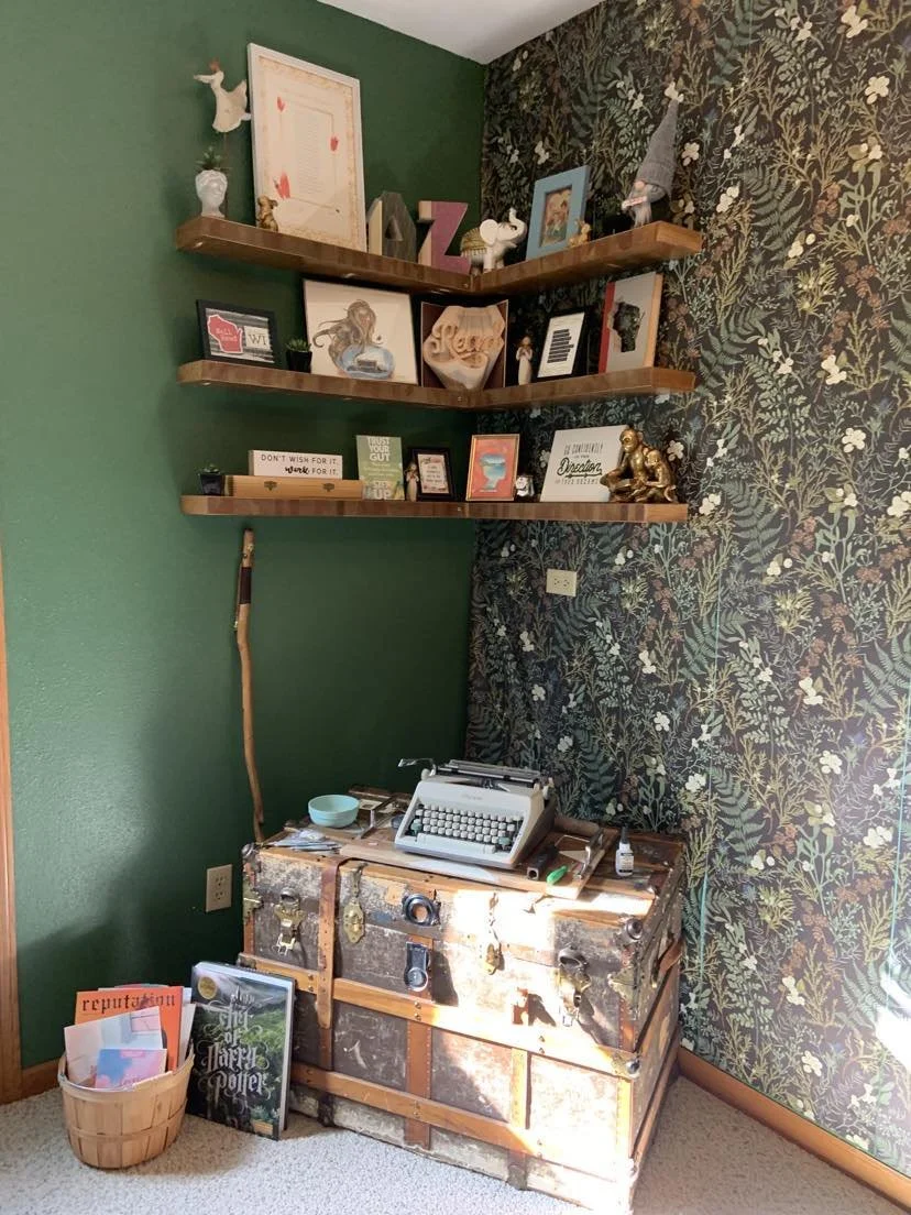 If you’ve been feeling uninspired in your workspace (either at work or home) take this as your sign to spruce up your space! If your significant other or co-worker gives you push back or looks confused at your sudden HGTV dreams, just tell them Amanda said you could do it! I’ve been gathering the materials for this office remodel for like the last year and finally I decided that if I didn’t just write it into my calendar it wasn’t going to happen. So I did, and then, I did. (With a lot of help. Thanks mom, Kate (my sister), Dave (the handy-man) and Matt (my husband) for your sweat equity and also for the items you gifted me to complete the space.) I am IN-LOVE with my moody forest vibes office and am so excited that I now get to create all sorts of word nerd goodness surrounded by this greenery, comfort, and magic. To see a shopping list of items I used and maybe snag a few for yourself, keep scrolling.